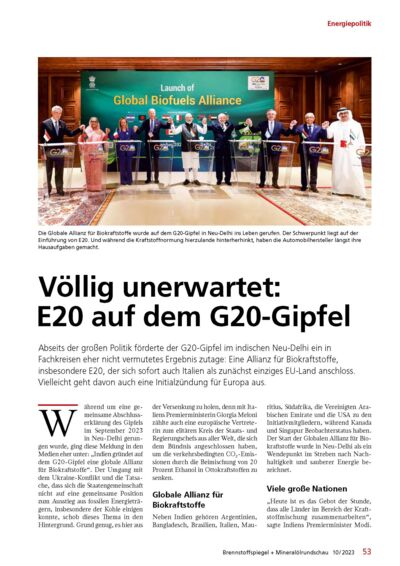 Bereits im Jahr 2023 wurde im Rahmen des G20-Gipfel in Neu-Delhi eine globale Allianz für Biokraftstoff gegründet. Zu den Initiativmitgliedern gehören neben Gastgeber Indien Argentinien, Bangladesch, Brasilien, Mauritius, Südafrika, die Vereinigten Arabischen Emirate und die USA. Als einziges europäisches Land ist Italien in der Allianz vertreten. Kanada und Singapur haben einen Beobachterstatus eingenommen.