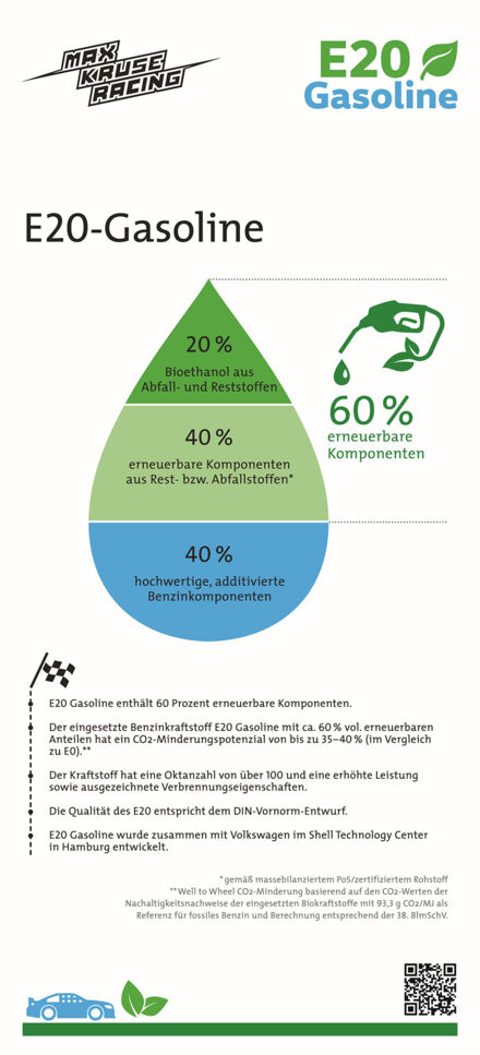 „Dass das Max Kruse Racing Team mit E20 Blue Gasoline erfolgreich seine Rennen bestreitet und andere Teams den Kraftstoff übernommen haben und nun ebenfalls E20 verwenden, ist auch ein starkes Zeichen für den allgemeinen Straßenverkehr und mehr Klimaschutz“, betonte Alois Gerig, Vorsitzender des Bundesverbandes der deutschen Bioethanolwirtschaft, der die Hersteller von nachhaltigem Bioethanol vertritt. „Hierzulande werden durch die Beimischung von Bioethanol zu Benzin jährlich schon mehr als drei Millionen Tonnen CO2 eingespart. Damit wird das Klimaschutzpotenzial durch höhere Anteile erneuerbarer Kraftstoffe aber bei weitem nicht ausgeschöpft. Mit einer baldigen breiten Markteinführung von E20 an Europas Tankstellen könnte das Klimaschutzpotenzial von erneuerbarem Ethanol erheblich besser genutzt werden“, zeigt sich der BDBe-Vorsitzende Alois Gerig abschließend überzeugt.
